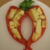 - Ízlés szerint teszünk a húsra gomba- és paprikaszeleteket, majd a paradicsomszószt, végül pedig a reszelt sajtot.